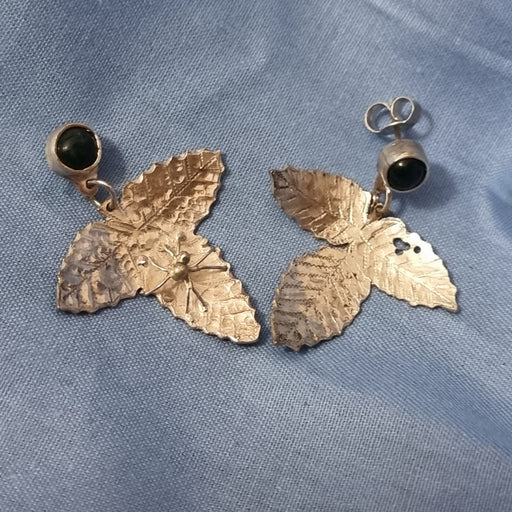 Elaine DayOriginal price £150.00 - Original price £150.00Original price£150.00£150.00 - £150.00Current price £150.00| /Earrings by Elaine Day Description - Bramble leaf earings with green moss agate studs. One leaf has a gold bodied spider and the other some ti...