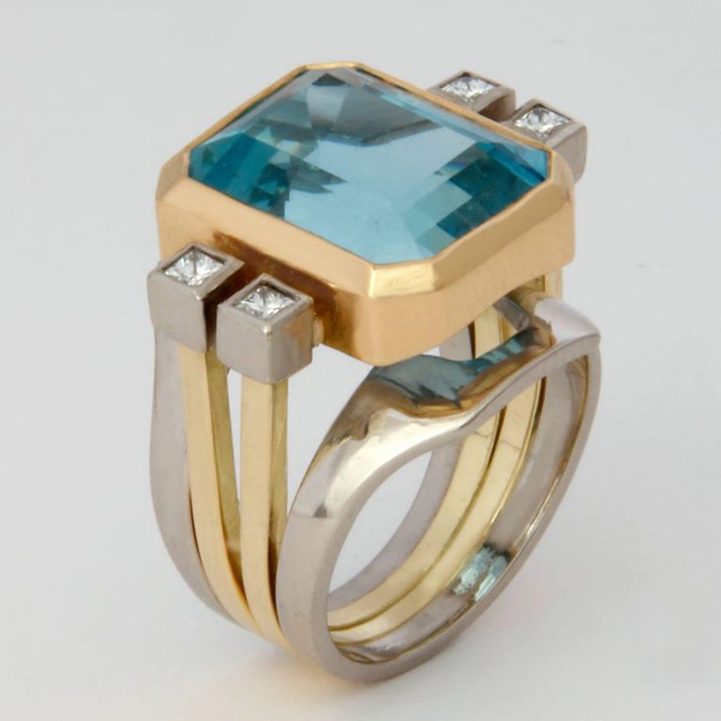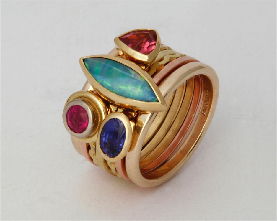 The decorative patterns, textures and colours of the Middle East influenced my signature, ‘Stacking Rings’. They started simply as combinations of different bands, then came the addition of the single stone version, followed by multi-stone arrangements and more recently flourished into Diamond Bridge Stacking Rings. The latest metamorphosis is the ‘Silver Aesthetic’ Stacking series, which draws on the unique qualities of silver. A whimsical offshoot of this series, is a zoomorphic form of stacking ring, see ‘Exotic Bird Ring’ with opals.