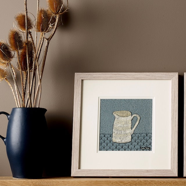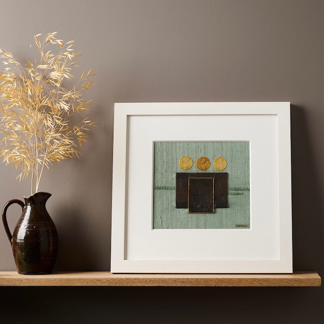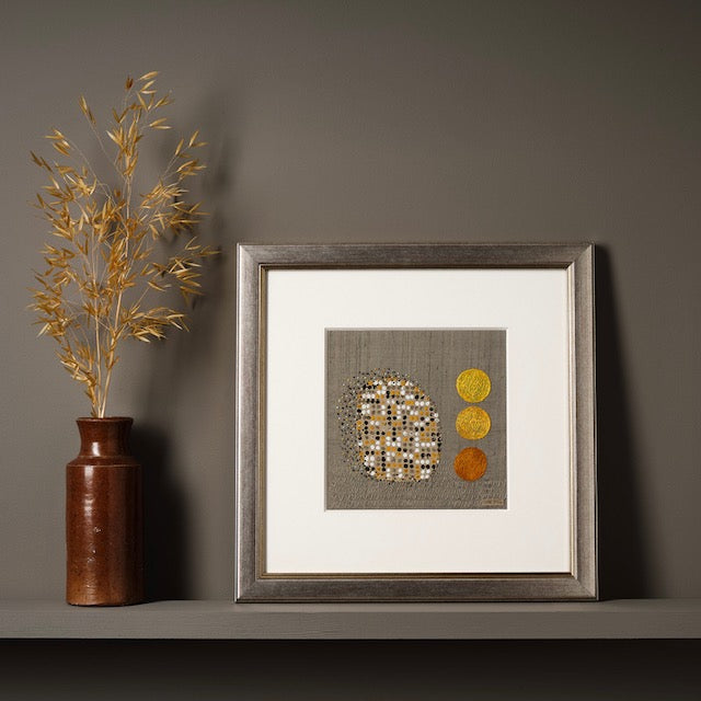 I have a background in fashion textile design and used this as a starting point for pictures that I loosely describe as embroideries. Using hand stitching and fabric combined with materials such as mirrored glass, metal foils, mother-of-pearl and wire to explores the possibilities of pattern, texture, colour and light.