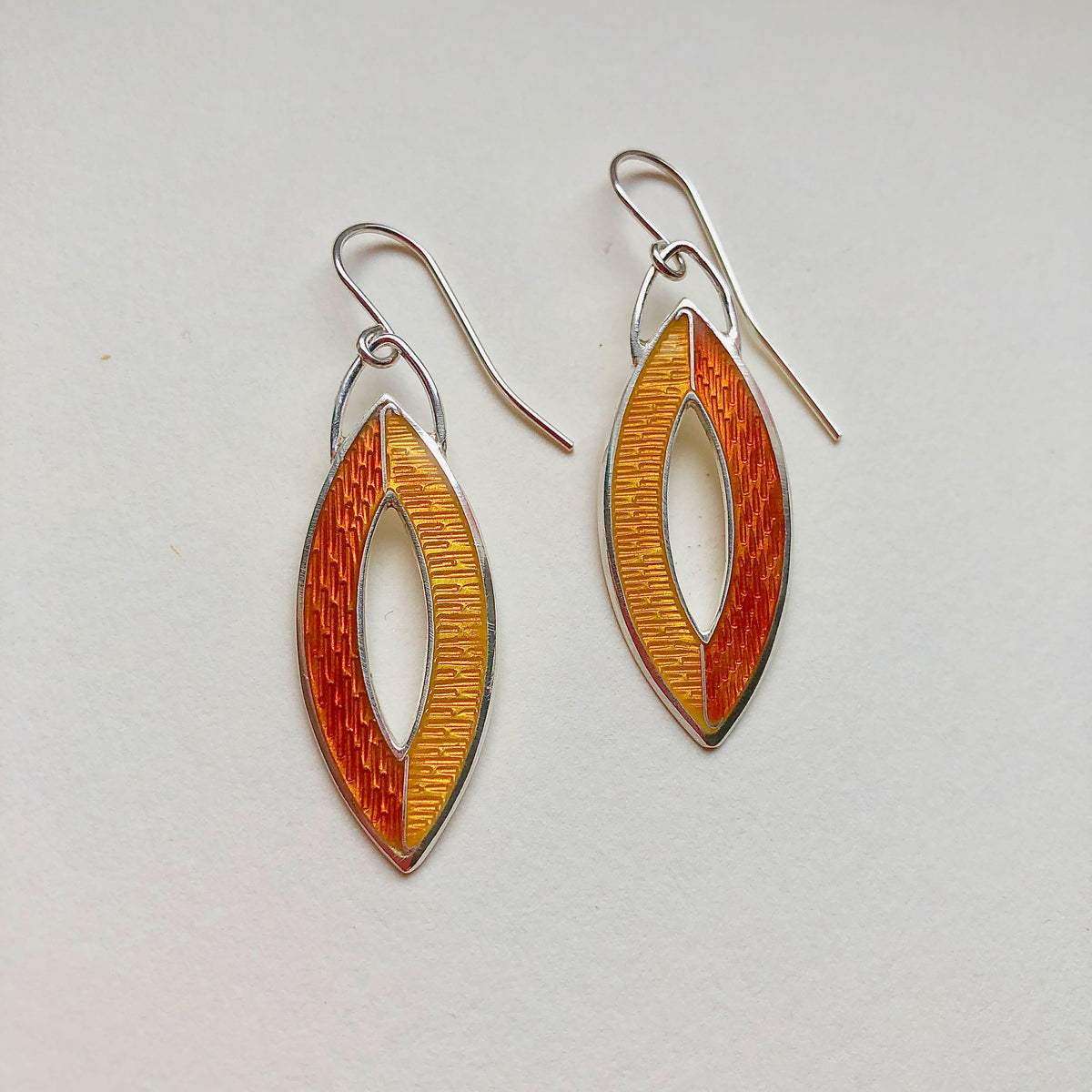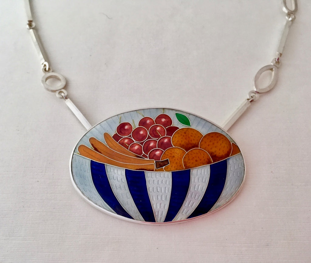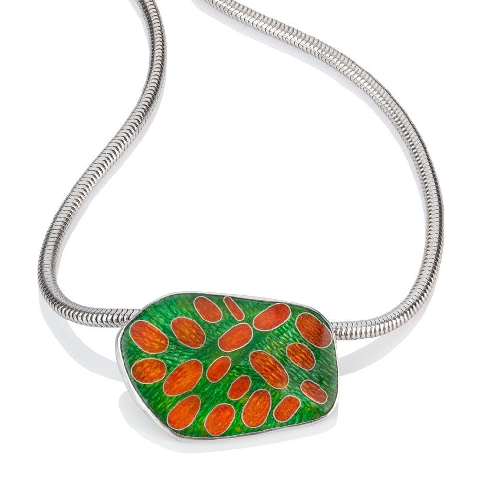 I love to use colour in my work and enamel gives me a huge range to play with. This, combined with different metals, silver, gold and copper with pearls and gold foil give my work a rich and sumptuous quality. My inspiration comes from nature, and leaves, seedpods and seaweeds all feature in my designs. I stylise the shapes resulting in bold and graphic pieces.