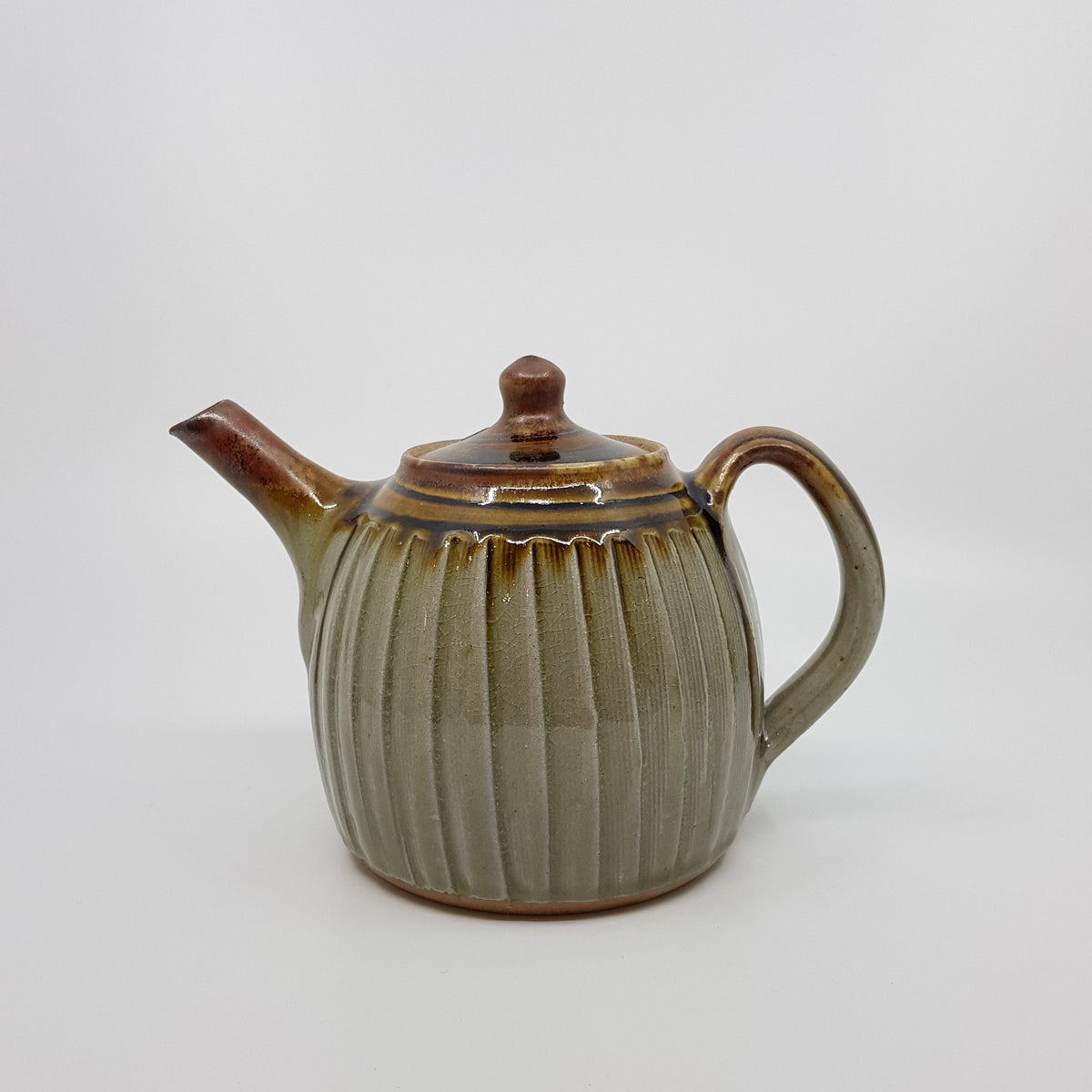 For the past few years, I have been concentrating on a range of forms, to which I have applied olive/celadon, ochre and shino glazes made up from wood ash and clay, ingredients both local to my studio.