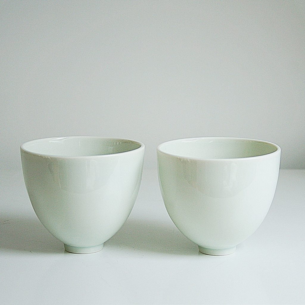 I throw my vessels on the wheel. I make with porcelain, for its delicacy and strength, and the pure surface it offers for a glaze. My pieces are thrown thinly, with an attention to every detail, in pursuit of balance and harmony. Surface decoration is minimal – an incised line on a foot or a rim, or slip marks round the swell of a moon jar. My work can be both functional and decorative.