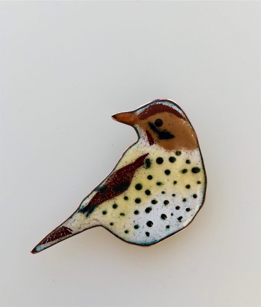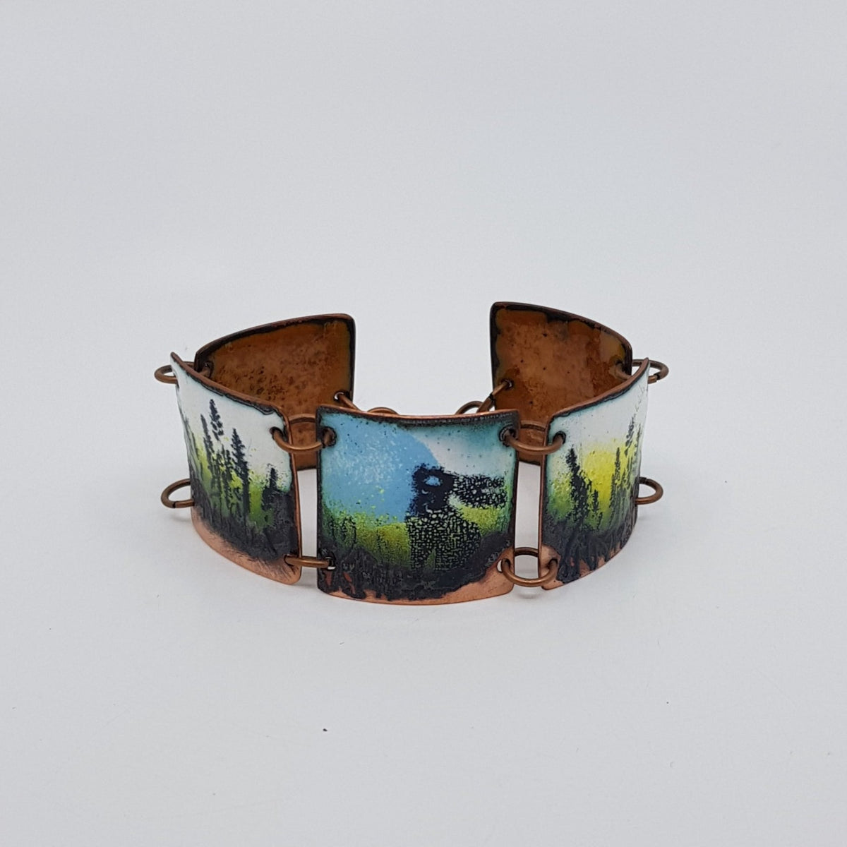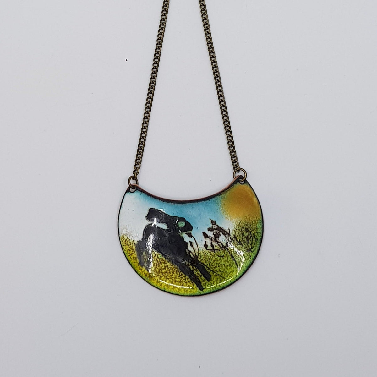 I use enamel on metal because I love the brilliancy of the coloured glass in contrast with the solidity of metal. I enjoy making jewellery because I see it as a medium that people use to tell stories about themselves, and also because I like to wear it myself!