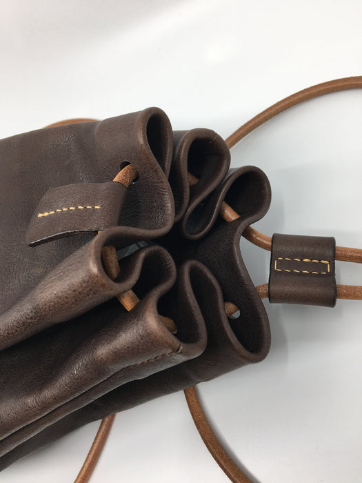 Hand stitched in linen with a brass zipped outside pocket. Leather cord straps used to draw bag closed so its secure when in use. Has an internal pocket also.